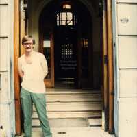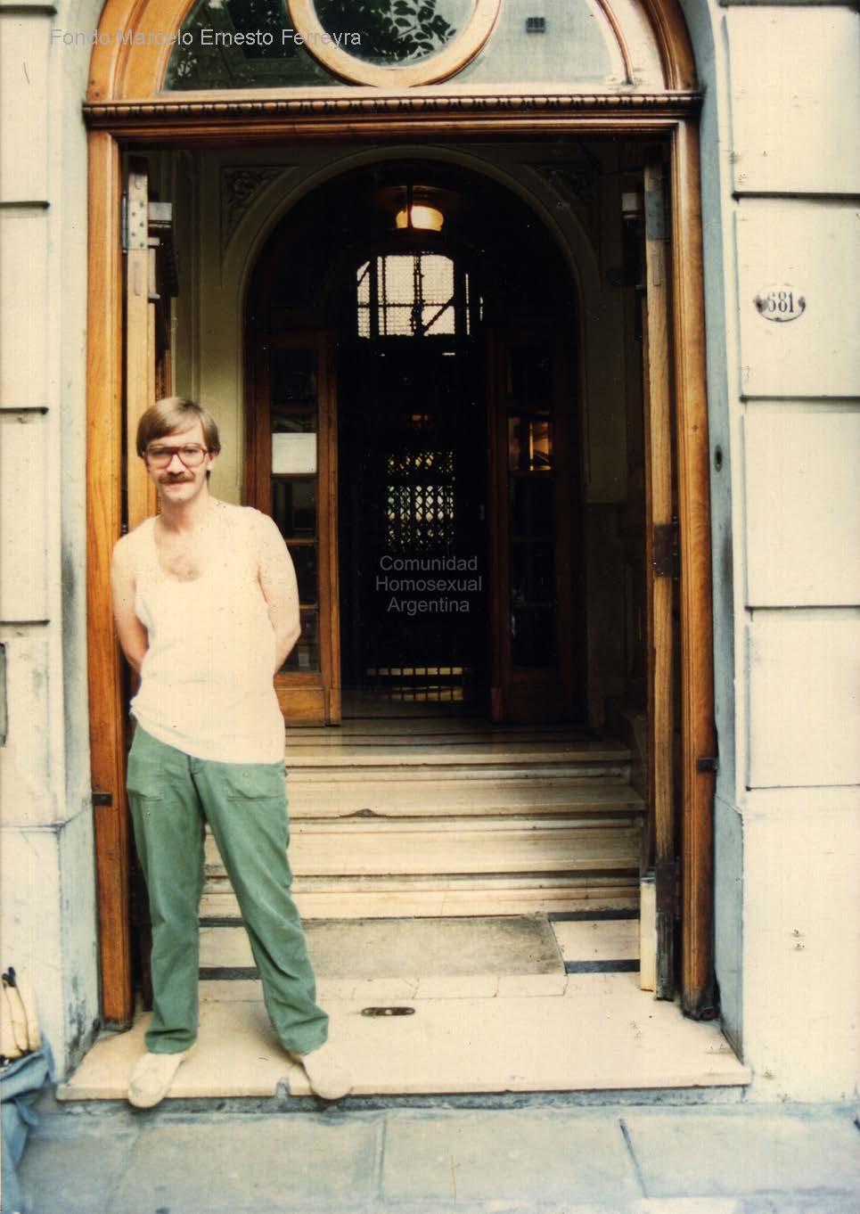 - Foto de Jauregui, Carlos en la puerta de entrada del edificio de la sede de la CHA sobre la calle Rodriguez Pena