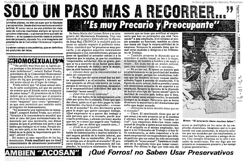 Aprender a mentir muy tempranoEntrevista a Rafael Freda, presidente de SIGLA, sobre la discriminación que viven las personas homosexuales en Argentina. Se describen experiencias escolares, laborales y familiares. También se aborda la situación social, legal y cultural de la comunidad gay en los años 90.