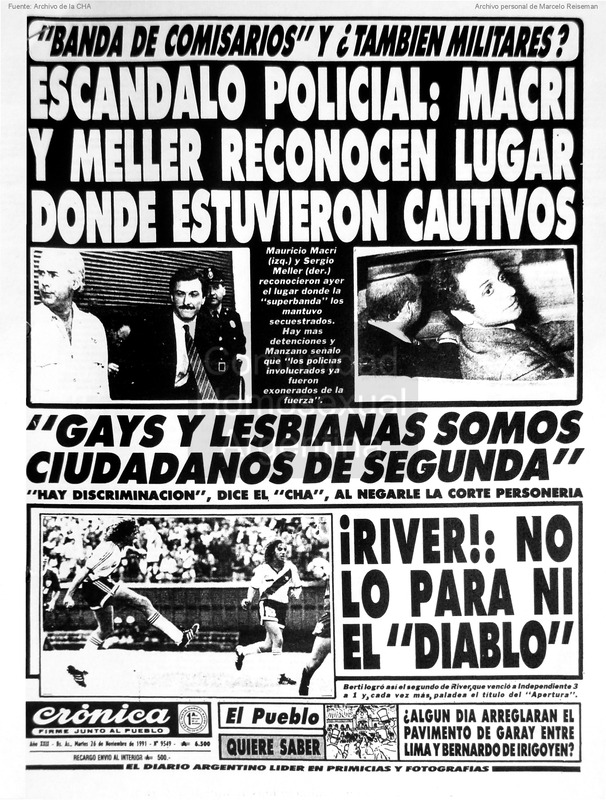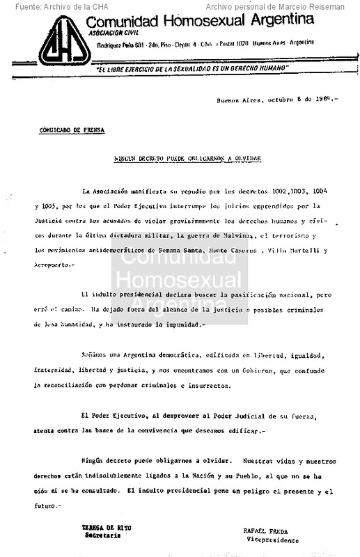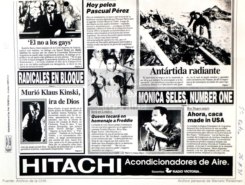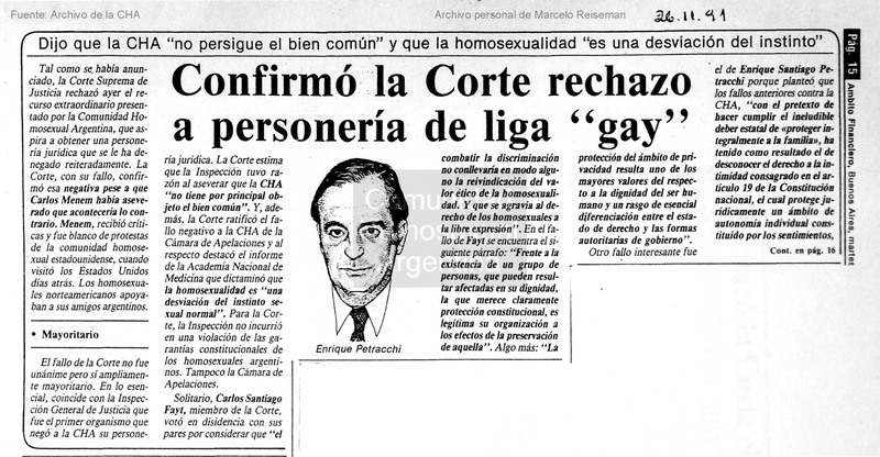 Gays y lesbianas somos ciudadanos de segundaLa Corte Suprema de Justicia rechaza el pedido de personería jurídica de la Comunidad Homosexual Argentina (CHA), lo que es calificado por la organización como un acto de discriminación. El fallo se produce una semana después de que el presidente Carlos Menem prometiera en Estados Unidos que se otorgaría la personería. La decisión del máximo tribunal fue por siete votos contra dos.