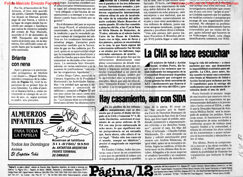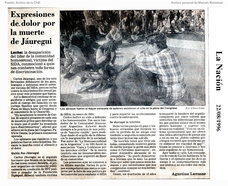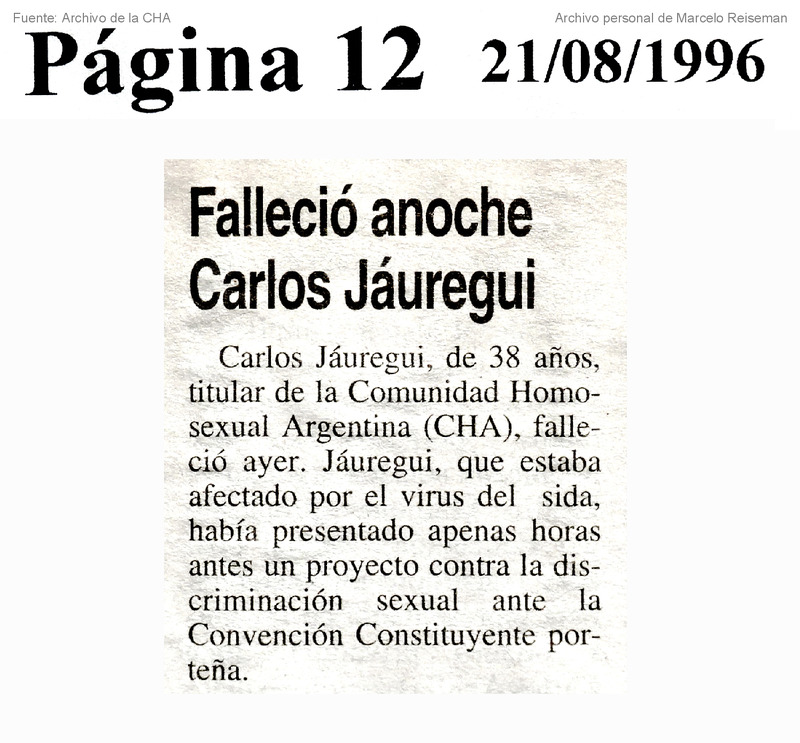 Falleció anoche Carlos JáureguiNota necrológica del diario Página/12 sobre el fallecimiento de Carlos Jáuregui, Primer presidente de la Comunidad Homosexual Argentina (CHA). Jáuregui, de 38 años, estaba afectado por el virus del SIDA. Se destaca que horas antes de su muerte había presentado un proyecto contra la discriminación sexual.