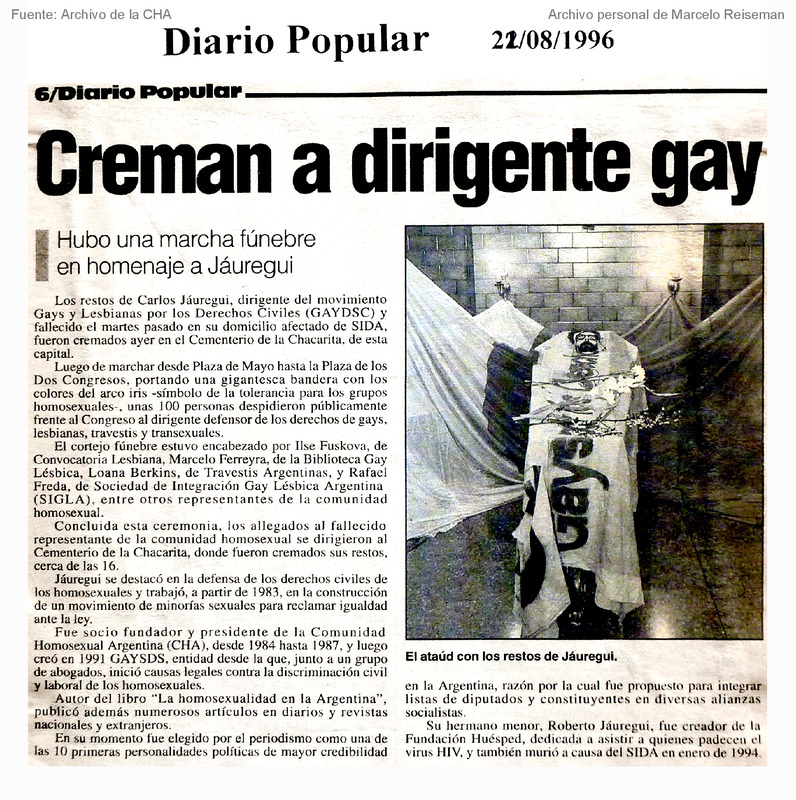 Creman a dirigente gayNoticia del Diario Popular sobre la cremación de los restos del dirigente gay Carlos Jáuregui. Se realizó una marcha fúnebre en su homenaje desde Plaza de Mayo hasta el Congreso. El cortejo fue encabezado por destacadas figuras del activismo como Cesar Cigliutti, Ilse Fuskova, Marcelo Ferreyra, Lohana Berkins y Rafael Freda.