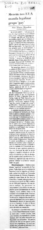 Menem nos EUA manda legalizar grupo gayArtículo del periódico "Jornal do Brasil" que informa sobre la decisión del presidente Carlos Menem de recomendar la legalización de la Comunidad Homosexual Argentina (CHA). Esta acción fue producto de la presión de organizaciones de gays y lesbianas estadounidenses durante la visita de Menem a Estados Unidos. Rafael Freda, presidente de la CHA, es citado en el artículo.