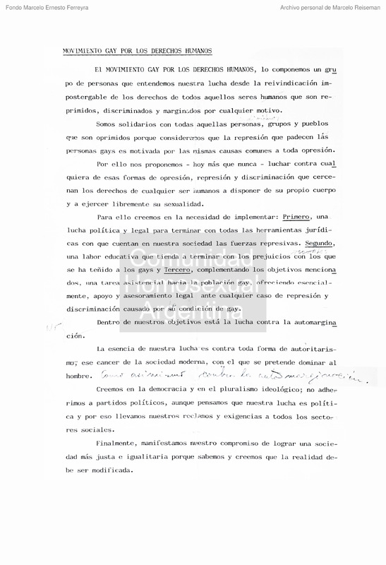 Movimiento gay por los derechos humanosDocumento escrito por Carlos Jáuregui que presenta la fundamentación teórica del "Movimiento Gay por los Derechos Humanos", basado en la experiencia de la CHA. El texto define los objetivos de la lucha política, legal y educativa contra la discriminación y la represión. Se postula una solidaridad con todos los grupos oprimidos.