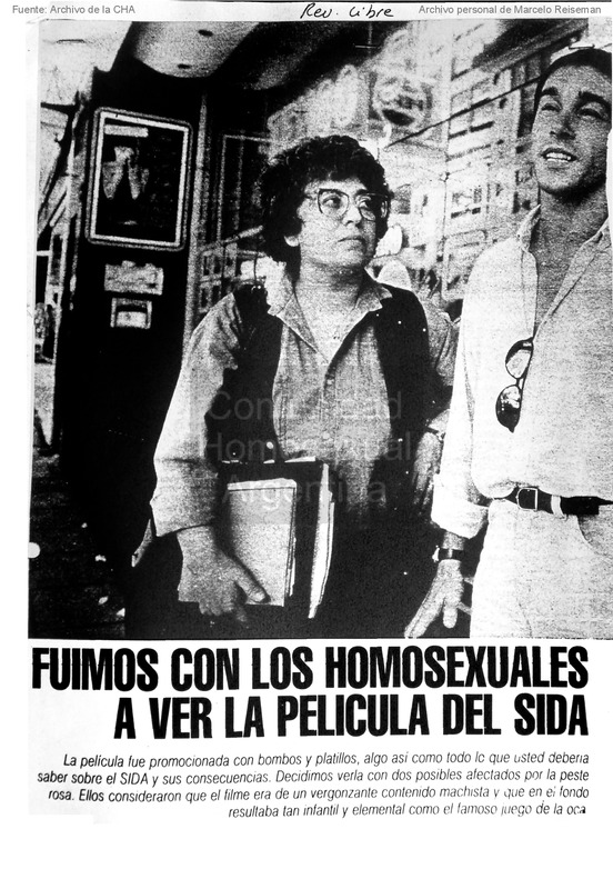 Fuimos con los homosexuales a ver la pelicula del SIDAEl artículo relata la experiencia de miembros de la Revista LIBRE al asistir a la proyección de una película sobre el SIDA junto a Alejandro Zalazar y Teresa De Rito, presidente y vicepresidenta de la Comunidad Homosexual Argentina (CHA). Se critica el contenido de la película por considerarlo machista, promiscua y con errores científicos, reflejando prejuicios hacia la homosexualidad. A pesar de la problemática del SIDA, los representantes de la CHA reafirman su lucha por la libre sexualidad y contra la marginación.