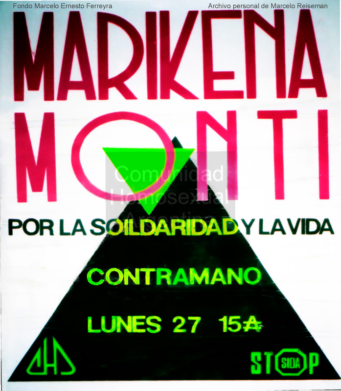 Campaña Stop SIDA, Marikena Monti en contramanoAfiche de la campaña "STOP SIDA" de la CHA, promocionando un show de Marikena Monti. Para recaudar fondos para la campaña