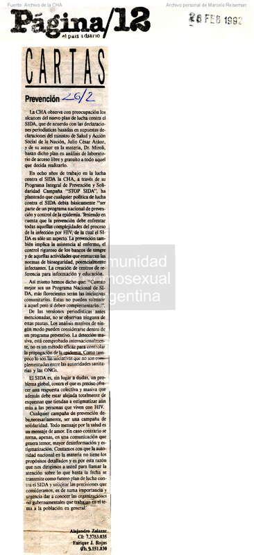 PrevenirLa Comunidad Homosexual Argentina (CHA) expresa su preocupación por el nuevo plan de lucha contra el SIDA, que se basa en análisis masivos y no en una prevención integral. La organización sostiene que la detección masiva no es un método eficaz y que cualquier campaña debe ser también una campaña de solidaridad. La carta está firmada por Alejandro Zalazar y Enrique Rojas, de la CHA.