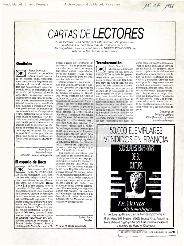 Ser gay en la argentinaSección de cartas de lectores en la que se publican respuestas a un artículo sobre la homosexualidad en Argentina. Se incluye una carta de la CHA, Angel Bruno y Alejandro Zalazar, y otra de Cuadernos de Existencia Lesbiana y ATEM.