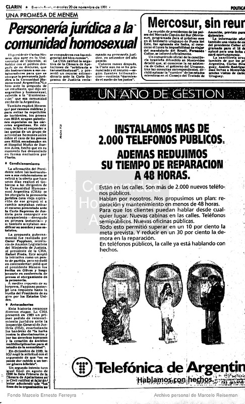 Una promesa de Menem Personería jurídica a la comunidad homosexualEl presidente Carlos Menem anuncia que dará instrucciones para que se otorgue la personería jurídica a la Comunidad Homosexual Argentina (CHA), en respuesta a una pregunta durante su visita a la Universidad de Columbia. La CHA había presentado un recurso ante la Corte Suprema de Justicia por este tema. El presidente también se refirió a la situación de los presos con SIDA.