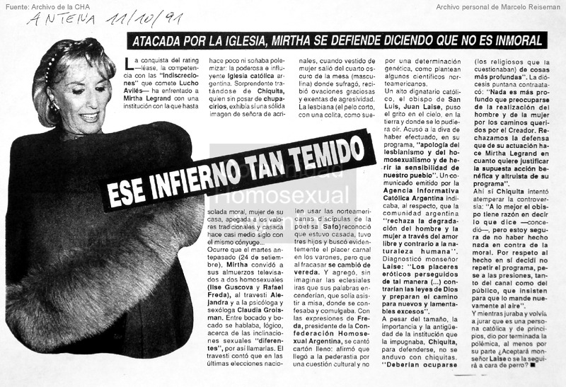 Atacada por la iglesia mirtha se defiende diciendo que no es inmoral ese infierno tan temidoArtículo sobre la polémica entre Mirtha Legrand y la Iglesia, en la que se debate sobre moral y la sexualidad.