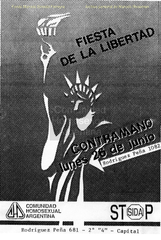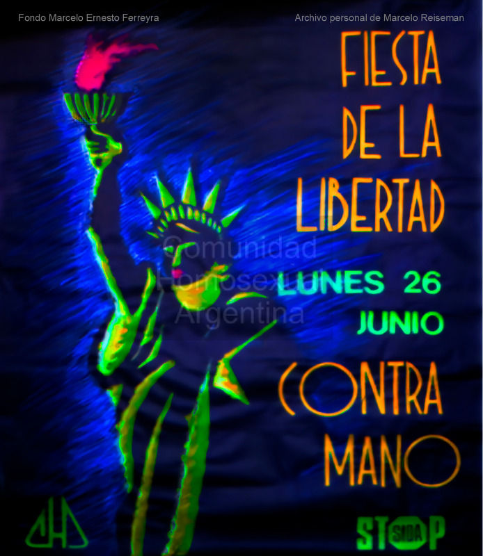 Fiesta de la libertadAfiche promocional de la "Fiesta de la Libertad" organizada por la Comunidad Homosexual Argentina (CHA). El evento tuvo lugar en la discoteca Contramano y formó parte de la campaña "STOP SIDA". Esta fiesta representaba un acto de reivindicación y celebración de la identidad.
