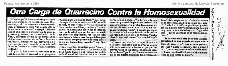 Otra carga de Quarracino contra la homosexualidadEl arzobispo de Buenos Aires, Antonio Quarracino, critica duramente la homosexualidad, calificándola como un "desvío de la naturaleza humana" y elogia la decisión de la Corte Suprema de negar la personería jurídica a la Comunidad Homosexual Argentina. El prelado considera "grosero, grotesco y hasta estúpido" afirmar que la homosexualidad es otra forma de amor. Además, en el mismo espacio televisivo, reclama un relevamiento sanitario ante la amenaza del cólera.