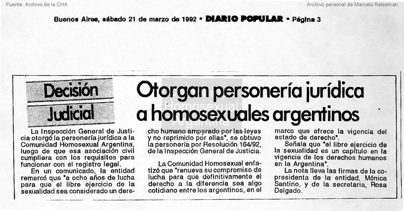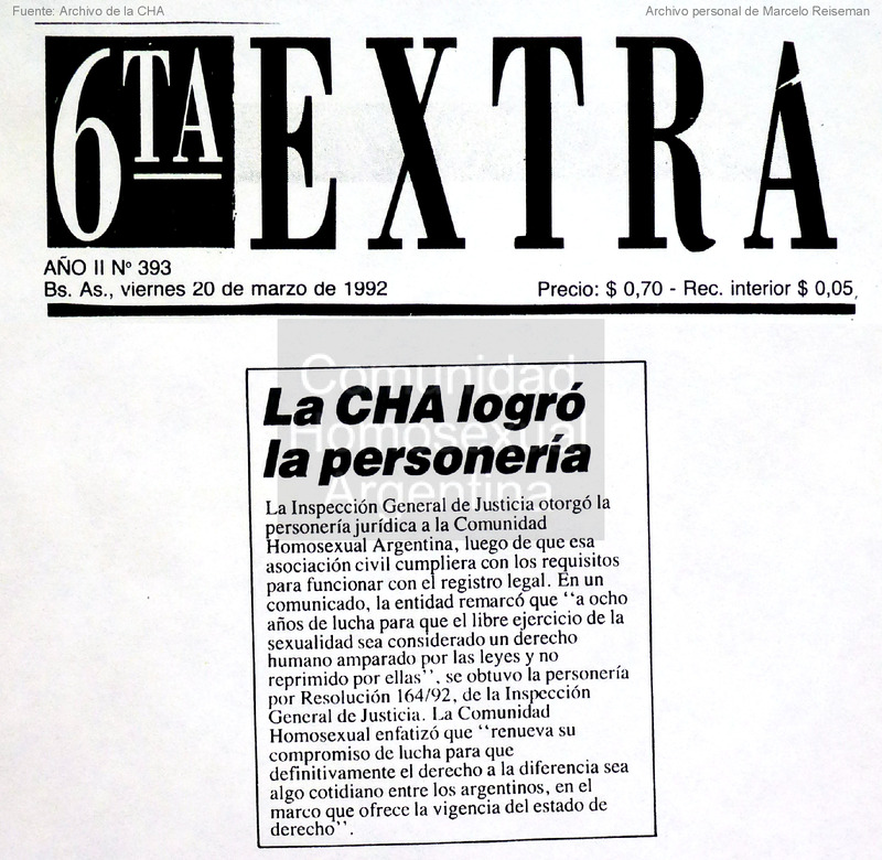 La CHA logro la personeriaLa Inspección General de Justicia otorga finalmente la personería jurídica a la Comunidad Homosexual Argentina (CHA), tras ocho años de lucha de la organización. La resolución, número 164/92, marca un hito en la lucha por los derechos de la comunidad homosexual en Argentina. La CHA renueva su compromiso de seguir trabajando por el derecho a la diferencia y la vigencia de los derechos humanos.