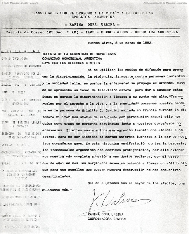 TRANSDEVI a CHA ICM GaysDC solidarisandose por declaraciones de QuarracinoLa organización Transexuales por el Derecho a la Vida y a la Identidad (TRANSDEVI) envía una carta a la Comunidad Homosexual Argentina (CHA), la Iglesia de la Comunidad Metropolitana (ICM) y Gays por los Derechos Civiles (GaysDC) en solidaridad por las declaraciones del cardenal Antonio Quarracino. En la carta, TRANSDEVI llama a formar un bloque sólido entre los "marginados sexuales" para luchar contra la discriminación. La misiva está firmada por Karina Dora Urbina.