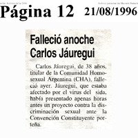 - Nota necrológica del diario Página/12 sobre el fallecimiento de Carlos Jáuregui, Primer presidente de la Comunidad Homosexual Argentina (CHA). Jáuregui, de 38 años, estaba afectado por el virus del SIDA. Se destaca que horas antes de su muerte había presentado un proyecto contra la discriminación sexual.