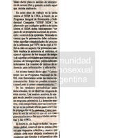 - La Comunidad Homosexual Argentina (CHA) expresa su preocupación por el nuevo plan de lucha contra el SIDA, que se basa en análisis masivos y no en una prevención integral. La organización sostiene que la detección masiva no es un método eficaz y que cualquier campaña debe ser también una campaña de solidaridad. La carta está firmada por Alejandro Zalazar y Enrique Rojas, de la CHA.